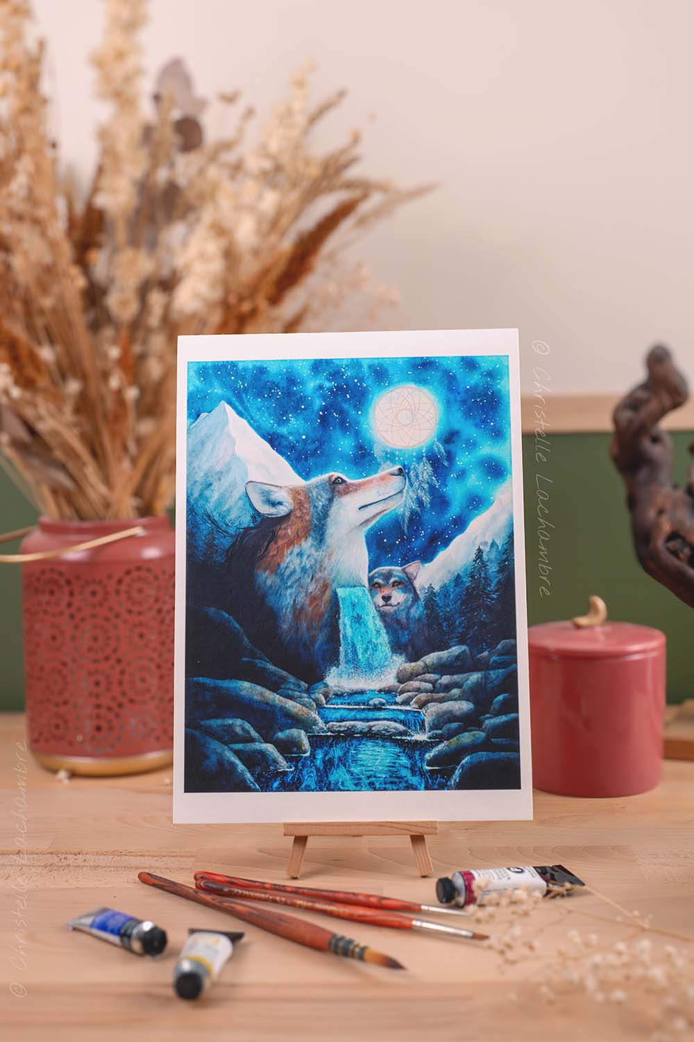 L’œuvre originale, dont est tiré ce tirage, marie aquarelle, acrylique et encre pour capturer la magie d’une nature qui résiste. Les pigments argentés de la cascade et de l’attrape-rêve lunaire y dansent comme un hommage à leur beauté sauvage. Tandis que le second loup, discret en arrière-plan, évoque leur vie en meute – une solidarité dont nous aurions tant à apprendre.